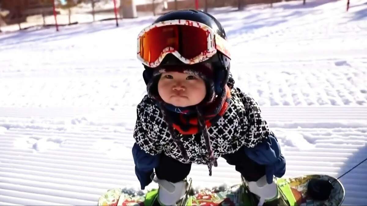 One girl was 11 months old when she wowed the crowd on the slopes in China. She can barely walk, but she slid down with ease. Afterwards, she gets a high-five from dad. Another 2-year-old also went down the hill with grace. Dad also gives her a high-five.