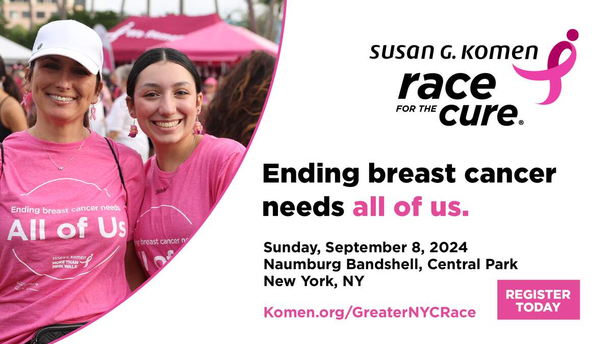 Join us on Sunday, September 8th for Greater New York City’s Komen’s Race For The Cure. For more information visit komen.org. Presented nationally by Bank of America.