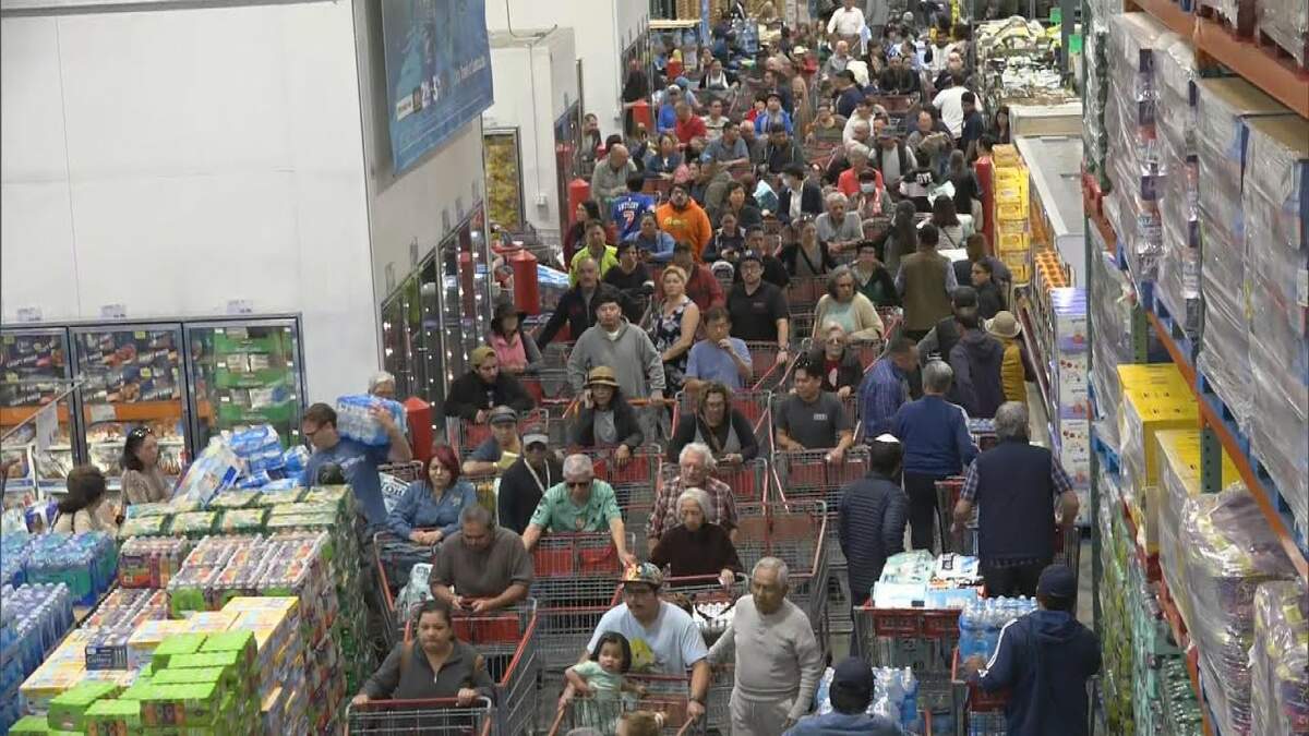 As hundreds of shoppers storm this Los Angeles Costco to stock up on goods as fears of coronavirus grow, they’re met with a warning – supplies are being rationed to keep up with the unprecedented panic shopping.