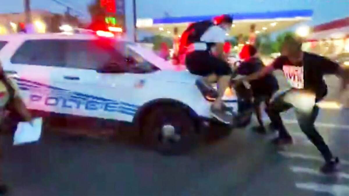 A police vehicle under siege plowed through a crowd of protesters in Detroit, injuring five people.