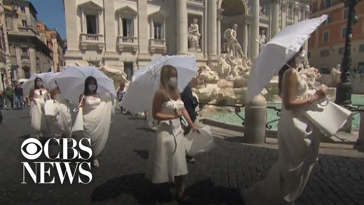 Around 15 women posed in front of the Trevi fountain as they held white parasols and wore matching white face masks.Â