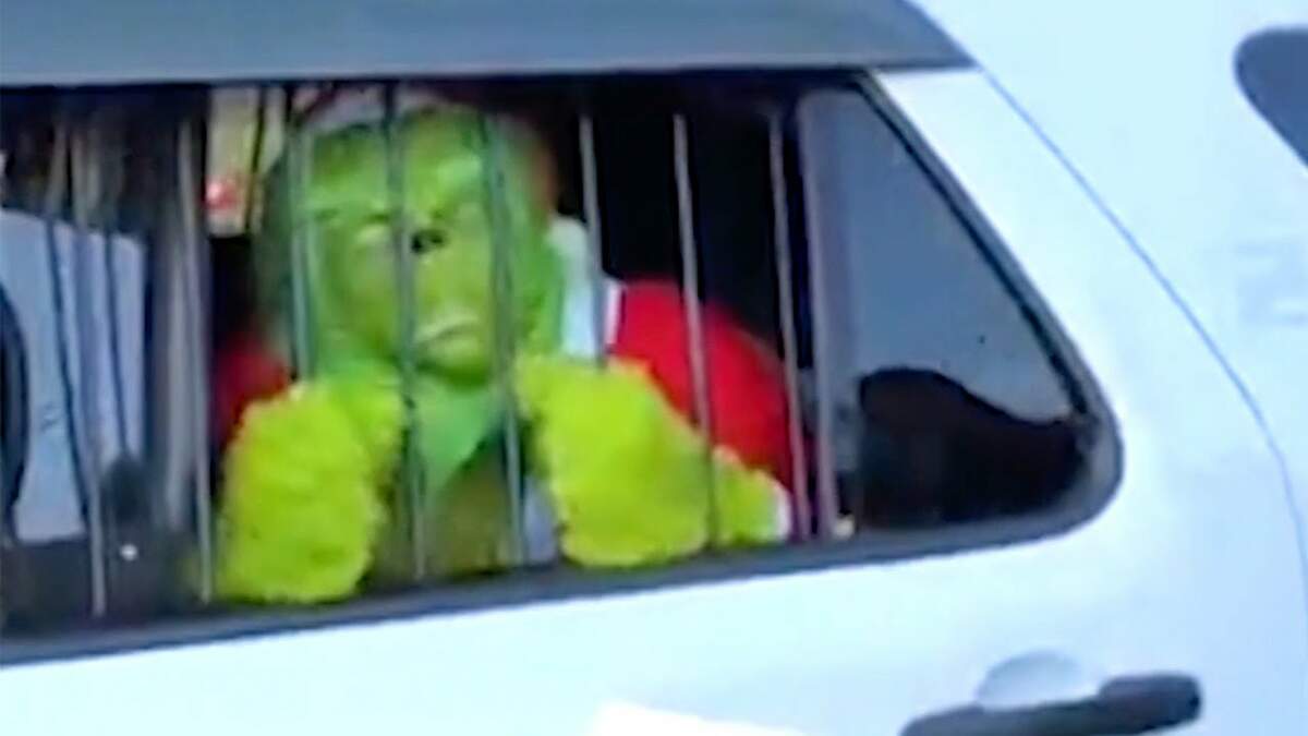In a short video, the Grinch is shown with his hands behind his back as he's being led away by an officer.