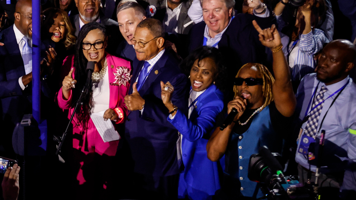 The King of Crunk made his way around the floor of the United Center and even encouraged attendees to chant "We're not going back." Before he bowed out for the night, Lil Jon flipped his iconic hook from "Get Low" to say "VP Harris, to the Walz" as a nod to the presidential candidate and her running mate, Minnesota Gov. Tim Walz. Jon stood with Georgia Representatives Raphael Warnock, Nikema Williams and others as they solidified their support for the Harris/Walz campaign.